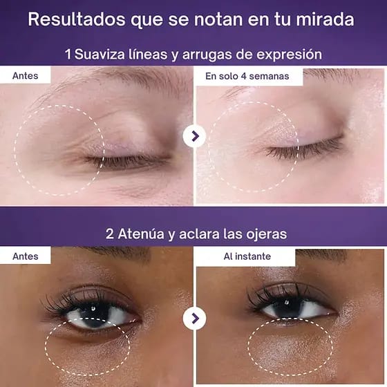 Está diseñada para reafirmar, rellenar y rejuvenecer la piel del contorno de ojos, reduciendo arrugas, líneas finas, ojeras y flacidez. Además, fortalece la barrera cutánea y mejora la hidratación.